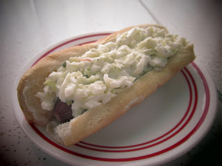 Whenever our family goes swimming, we love to picnic on hot dogs and brats afterwards. My husband mans the grill, and I get to kick back and enjoy it. With the Redi-Set-Go, I can "grill" hot dogs anytime for my little one (or myself) without ever firing up the outdoor grill. My personal favorite topping for hot dogs is simply cole slaw. I believe adding cole slaw to hot dogs is something done regularly in the South (I could be wrong, though); either way, I can't take credit for this combination. I heard of this idea as a very young child when my parents took me to a small restaurant in Amherst, Ohio called "Hot Dog Heaven." One day, I'd like to take my own child(ren?) there.